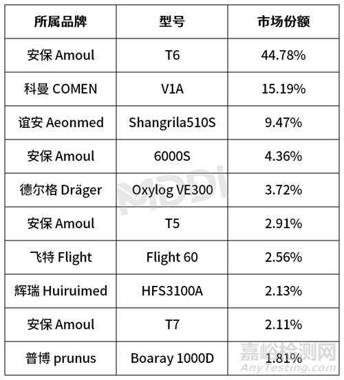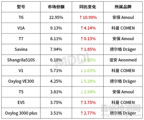 表2 2023年急救和轉(zhuǎn)運(yùn)呼吸機(jī)各型號(hào)市場(chǎng)份額變化情況Top10(銷售金額)