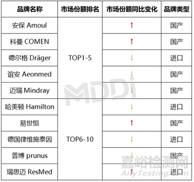 2023年我國(guó)急救和轉(zhuǎn)運(yùn)呼吸機(jī)各品牌市場(chǎng)份額變化較大,國(guó)產(chǎn)品牌中,安保、科曼、誼安和邁瑞占據(jù)市場(chǎng)份額前五位中四個(gè)名額,此外易世恒、瑞思邁的市場(chǎng)份額也有上升;在進(jìn)口品牌中,德爾格市場(chǎng)份額雖然同比略微下降,但仍占進(jìn)口品牌份額第一位。