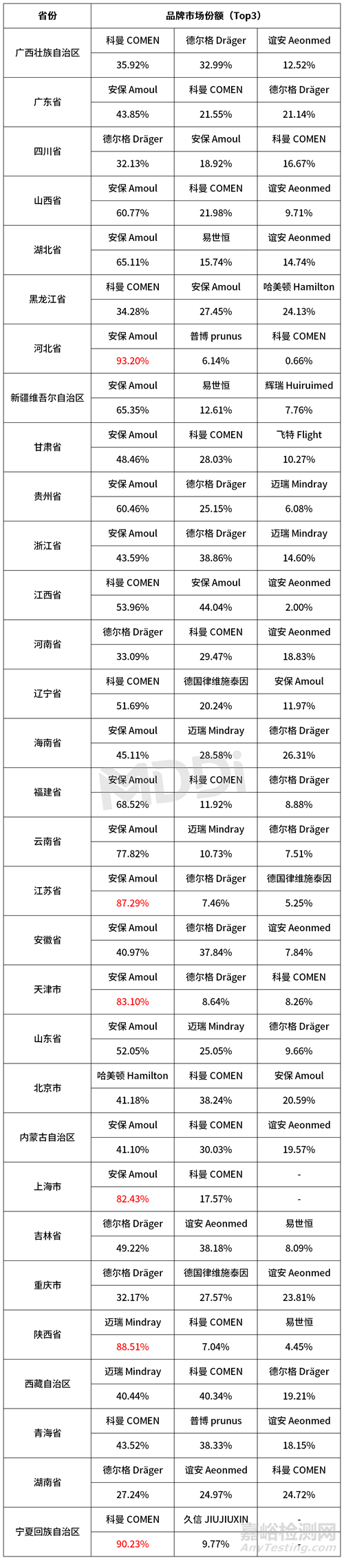 從各省、直轄市和自治區(qū)的品牌市場(chǎng)份額來(lái)看,2023年市場(chǎng)銷售額前三的廣西、廣東和四川地區(qū)分別為科曼、安保醫(yī)療和德爾格醫(yī)療占據(jù)首位;安保醫(yī)療在全國(guó)16個(gè)地區(qū)的市場(chǎng)份額排名第一,主要集中在華南、華北和華東地區(qū),在河北、江蘇、上海和天津的市場(chǎng)份額超過(guò)80%;科曼在全國(guó)6個(gè)地區(qū)的市場(chǎng)份額排名第一,主要集中在東北和西北地區(qū),在寧夏市場(chǎng)份額超過(guò)90%;德爾格醫(yī)療在全國(guó)5個(gè)地區(qū)的市場(chǎng)份額排名第一,主要集中在華中和西南地區(qū),在吉林省市場(chǎng)份額接近50%;誼安醫(yī)療在多個(gè)省市場(chǎng)份額均居前三,但沒有占據(jù)市場(chǎng)份額首位的??;邁瑞醫(yī)療在全國(guó)2個(gè)地區(qū)市場(chǎng)份額排名第一,陜西省份額超過(guò)80%。