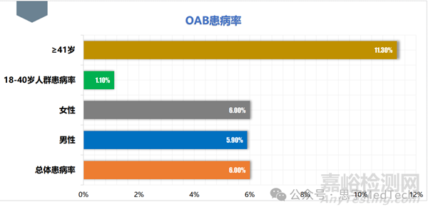 中國OAB的總體患病率為6.0%,其中男性患病率5.9%,女性患病率為6.0%。
