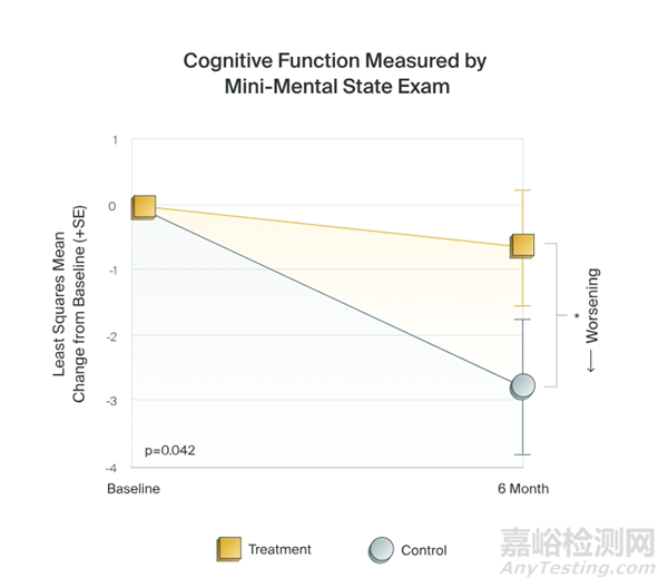 1. 觀察到認知能力在 6 個月內(nèi)顯著保持。與對照組相比,接受治療的患者的 MMSE 評分測量的認知能力下降減少了 76%(p<0.05)。