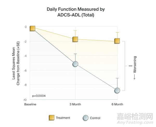 2. 與對照組相比,接受積極治療的患者 ADCS-ADL 總評分降低了 77%(p<0.001),這是臨床上接受的患者功能指標(biāo)。