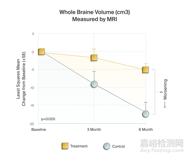 3. 通過 MRI 測量,與對照組相比,接受積極治療的患者腦萎縮或體積減少速度減緩了 69%(p<0.01)。