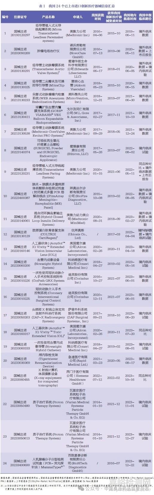 本文匯總了我國(guó)已上市的24 個(gè)進(jìn)口創(chuàng)新醫(yī)療器械產(chǎn)品的基本信息以及在美國(guó)的獲批時(shí)間,見表1。需要說明的是,這24 個(gè)產(chǎn)品不一定在美國(guó)首先上市,可能選擇了在歐盟、研發(fā)地或生產(chǎn)地申請(qǐng)上市。本文只列舉了這24 個(gè)產(chǎn)品在美國(guó)的上市時(shí)間。一是因?yàn)槊绹?guó)作為全球醫(yī)療器械的主要市場(chǎng),產(chǎn)品獲得FDA的批準(zhǔn)具有參考意義。二是筆者希望通過與美國(guó)突破性醫(yī)療器械程序(Breakthrough Medical Device Program) 進(jìn)行對(duì)比,分析其優(yōu)勢(shì),以獲得提升我國(guó)相關(guān)規(guī)定的啟示。