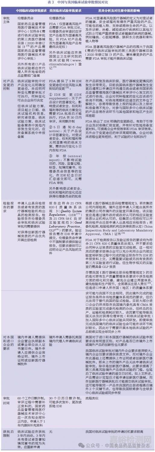 我國(guó)規(guī)定在境內(nèi)開展臨床試驗(yàn)的產(chǎn)品需要提供檢測(cè)報(bào)告用于倫理審批。對(duì)于需要臨床試驗(yàn)審批的第三類高風(fēng)險(xiǎn)產(chǎn)品,還需在臨床備案前獲得臨床試驗(yàn)批件;未在境外上市的進(jìn)口產(chǎn)品,需在臨床試驗(yàn)審批中提交創(chuàng)新批件。檢測(cè)報(bào)告可以是申請(qǐng)人出具的自檢報(bào)告或者有資質(zhì)的醫(yī)療器械檢驗(yàn)機(jī)構(gòu)出具的檢測(cè)報(bào)告。FDA對(duì)開展臨床的審批流程與我國(guó)類似, 申請(qǐng)人需準(zhǔn)備研究性器械豁免(investigational device exemption,IDE)的遞交。對(duì)于非顯著高風(fēng)險(xiǎn)(non-significant risk,NSR) 的產(chǎn)品,IDE 僅需倫理審批;對(duì)于顯著高風(fēng)險(xiǎn)(significant risk,SR)的產(chǎn)品,還需要FDA 審批IDE 后才能開展臨床試驗(yàn)[13]。為此,本文對(duì)我國(guó)和美國(guó)的臨床審批流程進(jìn)行了詳細(xì)對(duì)比,見表3。