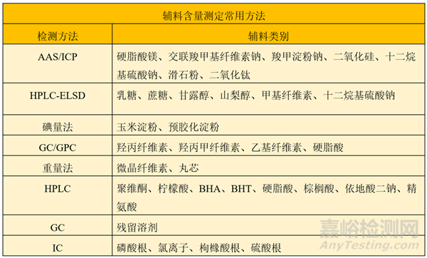 在大多數(shù)情況下,輔料的用量無法通過文獻(xiàn)獲得,采用逆向工程對原研制劑中的關(guān)鍵輔料進(jìn)行解析從而確定大概用量。常用的輔料含量剖析方法有元素分析法、色譜光譜法、質(zhì)量法等。質(zhì)量法適于定量用量較大的不溶性輔料,如微晶纖維素、丸芯。元素分析法適用與含金屬元素的輔料,如硬脂酸鎂、磷酸氫鈣、纖維素鈉、硬脂富馬酸鈉、羧甲淀粉鈉等。光譜、色譜法包括HPLC、GC-MS、LC-MS和UV等手段,可以測定多種輔料,如乳糖、蔗糖、羥丙纖維素等可采用HPLC法測定。