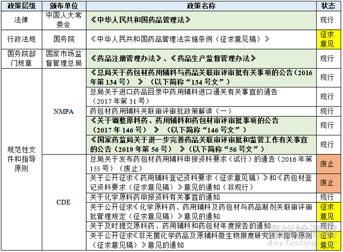 NMPA發(fā)布的《總局關(guān)于藥包材藥用輔料與藥品關(guān)聯(lián)審評審批有關(guān)事項(xiàng)的公告(2016年第134號) 》 、《關(guān)于調(diào)整原料藥、藥用輔料和藥包材審評審批事項(xiàng)的公告(2017年146號) 》 和《國家藥監(jiān)局關(guān)于進(jìn)一步完善藥品關(guān)聯(lián)審評審批和監(jiān)管工作有關(guān)事宜的公告(2019年第56號) 》是目前指導(dǎo)原輔包關(guān)聯(lián)審評審批具體實(shí)施最核心的規(guī)范性文件,三者內(nèi)容上有重合、有替代、有交叉,共同指導(dǎo)原輔包關(guān)聯(lián)審評審批。