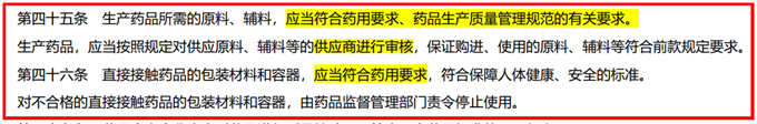 1)明確生產(chǎn)藥品的原輔包應(yīng)符合藥用要求。何為藥用要求呢?在此處并沒有明確規(guī)定,但是在56號文中有明確:藥用要求即輔料的質(zhì)量、安全及功效需滿足藥品的要求。