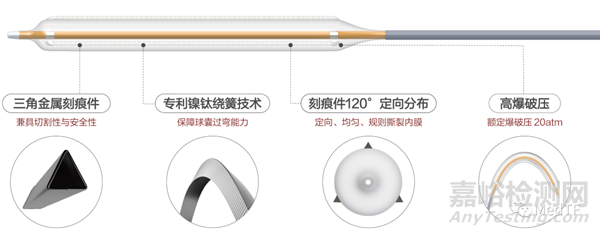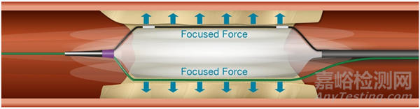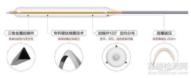 1.采用應(yīng)力集中(Focused Force)原理設(shè)計,刻痕絲作用于血管壁上的壓強≥32倍普通高壓球囊的壓強。同時球囊體的高壓非順應(yīng)性設(shè)計,額定爆破壓達20ATM,在刻痕絲應(yīng)力集中和高壓球囊擴張力的共同作用下,打開血管鈣化及內(nèi)膜增生病變。