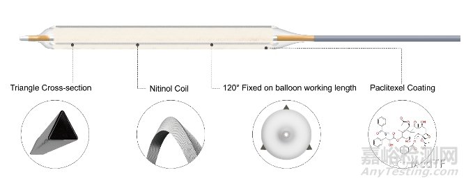 Dissolve AV是一款全新的刻痕藥物球囊,其采用類似于DKutting的“三角鎳鈦繞簧”技術(shù)制作的刻痕件,其截面為等邊三角形,三個切割件呈120°分布,牢牢固定在球囊工作段。針對高抵抗性狹窄病變,擴張時切割件不會滑動,三角形截面高效嵌入血管內(nèi)膜,輔佐以20atm額定爆破壓,全面提供定向擴張所需的局部高壓強。針對高度狹窄的迂曲病變,采用No Base Bonding技術(shù),進一步縮減球囊通過外徑,同時發(fā)揮了繞簧設(shè)計徑向柔順的優(yōu)勢,大幅提高球囊通過性。