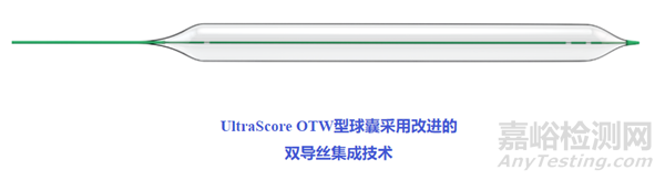 UltraScore設(shè)備是伴有兩條刻痕導(dǎo)絲的半順應(yīng)性球囊,兩條導(dǎo)絲間隔180°,在擴張時達到聚焦壓力,優(yōu)化球擴效果的目的。另外,其不透光的標記,可以幫助在射線下定位。