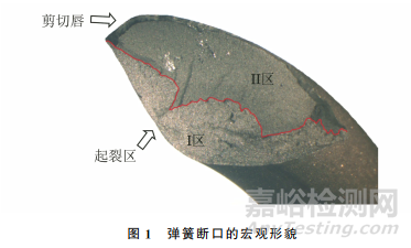 彈簧斷口的宏觀形貌如圖1所示。由圖1可知:斷口由兩個明顯不同的區(qū)域組成,Ⅰ區(qū)斷口粗糙,目視可見許多反光的小刻面,有收斂于彈簧內(nèi)徑表面的裂紋擴(kuò)展棱線,呈線源特征,彈簧起裂區(qū)表面無劃傷等機(jī)械損傷;Ⅱ區(qū)斷口顏色發(fā)灰,可見源自Ⅰ區(qū)斷口的裂紋擴(kuò)展棱線,斷口邊緣呈剪切唇特征。