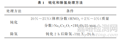 選取同批次原材料進(jìn)行氫元素含量測試,試樣尺寸(直徑×長度,下同)為4mm×5mm。將原材料進(jìn)行鈍化處理,并對鈍化后的試樣進(jìn)行氫元素含量測試,鈍化后試樣尺寸分別為5mm×5mm(未去除表層)和4mm×5mm(去除表層)。接著對試樣進(jìn)行除氫處理,并對除氫后的試樣進(jìn)行氫元素含量測試,除氫后試樣的尺寸分別為5mm×5mm(未去除表層)和4mm×5mm(去除表層)。鈍化和除氫處理方法如表1所示,氫元素含量測試結(jié)果如表2所示。由表2可知:原材料中未檢測出氫元素,鈍化后和除氫后試樣中均可檢測到一定含量的氫元素,除氫后氫元素含量有所降低。