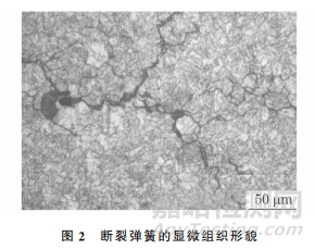 在斷裂彈簧斷口附近截面上取金相試樣,采用光學(xué)顯微鏡對試樣進(jìn)行觀察,結(jié)果如圖2所示。由圖2可知:彈簧無明顯脫碳現(xiàn)象,無過熱、過燒組織,試樣的顯微組織未見異常,組織均勻,裂紋沿晶擴(kuò)展,擴(kuò)展過程中裂紋出現(xiàn)樹枝狀分叉。