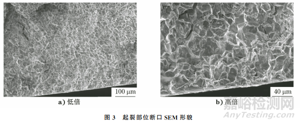起裂部位斷口SEM形貌如圖3所示。由圖3可知:斷口可見收斂于邊緣的裂紋擴(kuò)展棱線,未見明顯缺陷,斷口呈沿晶斷裂形貌,有二次裂紋,沿晶面上有較多的微觀顆粒相,少部分晶面呈雞爪痕特征,斷口無腐蝕形貌。