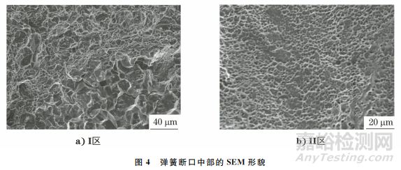 彈簧斷口中部的SEM形貌如圖4所示。由圖4可知:斷口Ⅰ區(qū)為沿晶斷裂區(qū),微觀形貌與起裂區(qū)附近基本一致,Ⅰ區(qū)和Ⅱ區(qū)之間沒有明顯的過渡區(qū),無腐蝕等其他特征;Ⅱ區(qū)為韌窩斷裂區(qū),斷口邊緣有剪切唇,為終斷區(qū)。