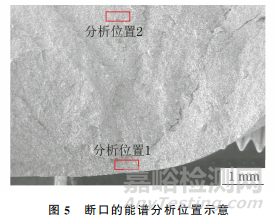 斷口的能譜分析位置如圖5所示,分析結(jié)果如表3所示。由表3可知:斷口Ⅰ區(qū)和Ⅱ區(qū)的化學(xué)成分基本一致。