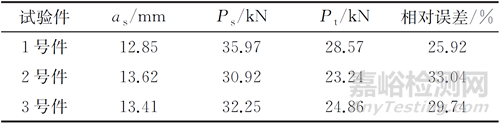 作者采用板兩側(cè)表面裂紋的測量長度(aS1,aS2)的均值aS作為裂紋長度,基于傳統(tǒng)斷裂韌度準(zhǔn)則(K≤KC,KC=KIC=35 MPa·m1/2)對60 mm厚試樣進(jìn)行剩余強(qiáng)度Ps評估,并與試驗(yàn)結(jié)果Pt進(jìn)行比較,結(jié)果見表2。對比發(fā)現(xiàn),采用表面裂紋長度估算的剩余強(qiáng)度值與試驗(yàn)值的相對誤差約為30%,預(yù)測結(jié)果偏危險(xiǎn)。