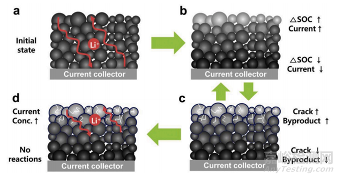 C:高電流密度導(dǎo)致活性顆粒破裂,暴露新界面,進而又導(dǎo)致了極片孔隙率的增加,鋰離子遷移到集流體側(cè)變得更難了,使得更高的電流密度發(fā)生在上部顆粒處,顆粒更破裂等等,形成負反饋。
