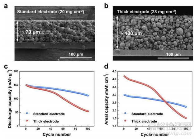 下圖是兩種厚度的電極截面圖,分別是70和100μm(標準電極、厚電極),其余的孔隙率、1C電流密度等設(shè)計參數(shù)基本保持一致,然后進行1C循環(huán)測試,在圖c中發(fā)現(xiàn),雖然100μm的厚電極相對70μm只有40%的容量增加,但電池循環(huán)100次之后,厚電極只有36%的容量保持率,而標準電極還有76%的容量保持率,即使考慮到體積比容量,在圖c中衰減后的厚電極依然比電極低很多,有意思的是,在圖c中,即使在最初循環(huán)過程中,厚電極和標準電極循環(huán)曲線接近,衰減程度相似,隨著循環(huán)增加,厚電極表現(xiàn)越來越差。