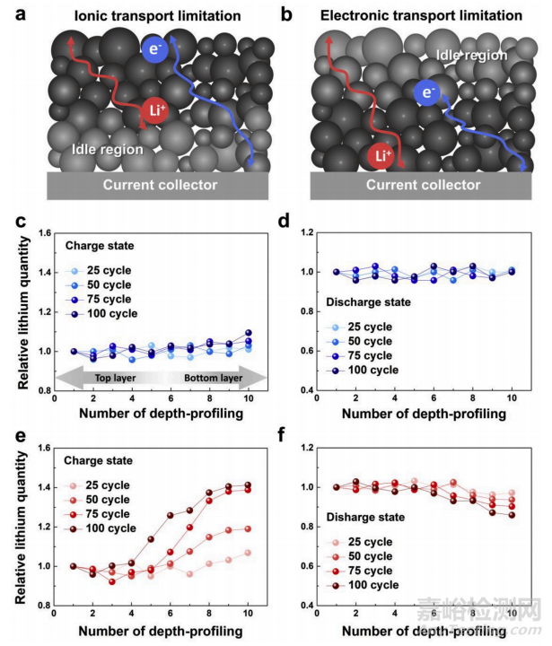在圖a中,解釋了鋰離子遷移慢決定反應(yīng)速率的過程,在靠近集流體的一側(cè),由于長距離的鋰離子不能很快地遷移過去,導(dǎo)致該區(qū)域的電化學(xué)反應(yīng)速率較低,而在靠近電極液的一側(cè),鋰離子和電子均保持較高的濃度,所以反應(yīng)能很好的進行;在圖b中,解釋了電子遷移慢決定反應(yīng)速率的過程,在靠近集流體的一側(cè),由于鋰離子能遷移過去,導(dǎo)致該區(qū)域的電化學(xué)反應(yīng)速率較高,而在靠近電極液的一側(cè),電子遷移受阻,存在濃度較低,反應(yīng)速率就變得較差,在圖中顏色越深,表明反應(yīng)越好。為了驗證兩種猜測,作者表征反應(yīng)過程中、充放電過程中,電極不同厚度下的SOC態(tài)特征,圖c、d是標準電極充放電過程中每隔25次循環(huán)的測試,x軸坐標越大,距離集流體的距離越近,從圖c、d可以看出,對于標準電極而言,充放電過程中,不同位置的SOC嵌鋰量幾乎一樣,說明即使在1C倍率下,電化學(xué)反應(yīng)均一,而在圖e中,在25次循環(huán),極片SOC還比較均一,從50次循環(huán)之后,電池充電過程中,鋰離子從正極擴散到負極,不同位置處的差異越來越大,與之前的循環(huán)保持率曲線也相符,靠近集流體測的嵌鋰量較高,說明反應(yīng)越慢,在圖f中發(fā)現(xiàn)厚電極在放電過程中,差異性并沒有特別明顯,作者認為這是由于前期的充電過程導(dǎo)致靠近集流體側(cè)的嵌鋰量多,而靠近電解液隔膜處的鋰離子少,所以放電過程,在隔膜處的鋰離子濃度高,也不會表現(xiàn)出太大的差異,從厚電極的SOC特征,能夠分析出是鋰離子遷移慢是容量衰減的重要原因。