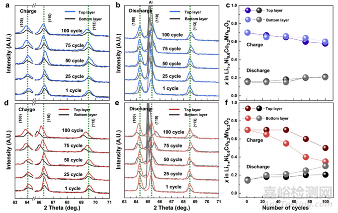XRD表征也驗證了嵌鋰量不均分布的猜測,從圖a,b的標準電極可以看出,不同循環(huán)之后,底部和頂部的XRD峰并沒有明顯差別,支撐數(shù)據(jù)表明在循環(huán)100次之后,不同位置SOC最大相差5%,而在d、f中可以看出底部和頂部存在嚴重的峰位置偏移。
