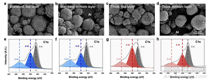 由于物質(zhì)傳輸導(dǎo)致的SOC不均一,導(dǎo)致電極在靠近隔膜的頂部位置,發(fā)生占比較高的電化學(xué)反應(yīng),而靠近集流體的底部卻反應(yīng)匱乏,隨著循環(huán)進行,厚電極會表現(xiàn)出越來越差的性能,而且在頂部位置反應(yīng)電流密度越發(fā)越大,形成電流熱點區(qū),進而破壞活性材料,造成裂紋或不可逆相變,高電流密度還會在二次顆粒中形成梯度很大的固相鋰離子濃度分布,產(chǎn)生應(yīng)力場,導(dǎo)致顆粒破碎,暴露新界面,發(fā)生副反應(yīng),在新界面形成厚的有機層,引起阻抗增加,從而變成電池的失效跳水。從下圖的厚電極c、g 和d、h中可以驗證上述解釋,C=O含量升高。