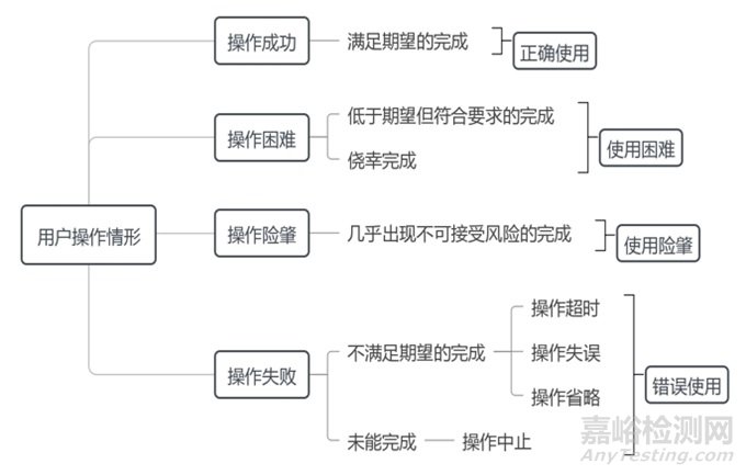 如圖3所示,用戶實際使用醫(yī)療器械的操作情形較為復(fù)雜,本指導(dǎo)原則根據(jù)操作任務(wù)完成程度將其分為操作成功、操作困難、操作險肇、操作失敗。