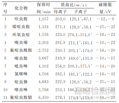 用50%(體積分?jǐn)?shù))乙腈溶液配制11種新煙堿類殺蟲劑質(zhì)量濃度均為1mg·L-1的單標(biāo)準(zhǔn)溶液,用兩通替換色譜柱自動(dòng)進(jìn)樣1μL,在ESI+模式下初步確定11種新煙堿類殺蟲劑的質(zhì)譜參數(shù),包含母離子、響應(yīng)值較高的子離子和各自的碰撞能量,進(jìn)一步通過軟件自動(dòng)優(yōu)化,確定各目標(biāo)物的母離子、子離子和最佳碰撞能量;再次進(jìn)樣選擇響應(yīng)值最高的子離子作為定量離子,響應(yīng)值低的為定性離子。優(yōu)化后的質(zhì)譜參數(shù)見表1。