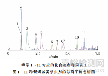 試驗(yàn)初始以0.1% (體積分?jǐn)?shù))甲酸溶液為水相,甲醇為有機(jī)相對11種新煙堿類殺蟲劑進(jìn)行分離。結(jié)果表明:當(dāng)目標(biāo)物質(zhì)量濃度較低時(shí),環(huán)氧蟲啶、噻蟲嗪和氟啶蟲胺腈的色譜峰峰形較寬,響應(yīng)值偏低;當(dāng)將甲醇換成乙腈時(shí),各目標(biāo)物的保留時(shí)間均提前,環(huán)氧蟲啶等的色譜峰峰形、響應(yīng)值明顯得到改善,其他目標(biāo)物的色譜峰無明顯差異;當(dāng)將水相中甲酸體積分?jǐn)?shù)調(diào)整為0.2%時(shí),11種目標(biāo)物的響應(yīng)值均有所提高,繼續(xù)增大甲酸體積比對響應(yīng)值無影響。因此,試驗(yàn)選擇以0.2%甲酸溶液為水相,乙腈為有機(jī)相。0.10μg·L-1混合標(biāo)準(zhǔn)溶液的總離子流色譜圖見圖1。