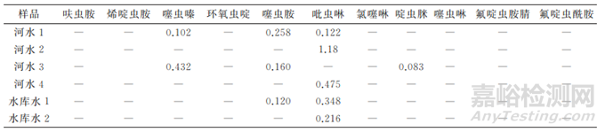 為驗(yàn)證方法的適用性,按照試驗(yàn)方法對隨機(jī)采集的山東地區(qū)(濰坊地區(qū)為主)的15份水樣(自來水8份,河水4份,水庫水3份)進(jìn)行檢測。結(jié)果顯示:8份自來水樣品和1份水庫水樣品中均未檢出新煙堿類殺蟲劑;4份河水樣品和2份水庫水樣品中新煙堿類殺蟲劑均有不同程度地檢出,具體檢出量見表4。
