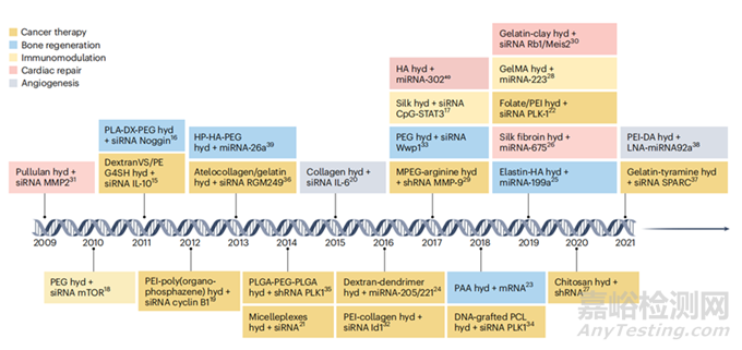 圖 1:最近基于水凝膠的 RNA 遞送的臨床前研究的時(shí)間表(Zhong[1]等, 2023)