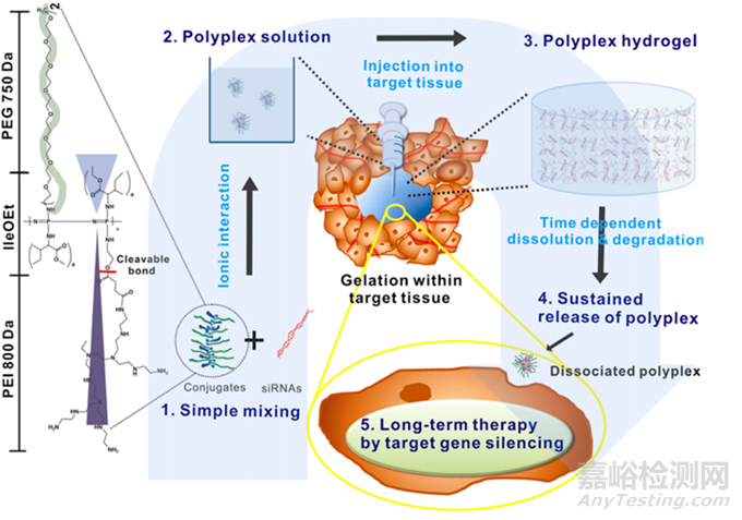 據(jù)另一項(xiàng)研究報(bào)道3,韓國(guó)科技技術(shù)研究所制備了一種可注射的具有可裂解酯鍵的熱敏陽(yáng)離子聚合物-低分子量聚乙烯亞胺聚(有機(jī)磷腈)共軛物,該共軛物可以與siRNA形成100nm的多聚物,該多聚物在體溫環(huán)境下通過疏水作用轉(zhuǎn)為多聚物水凝膠,藥物通過該聚合物的溶解和降解從水凝膠中緩慢釋放,可以實(shí)現(xiàn)長(zhǎng)達(dá)4周的基因沉默。