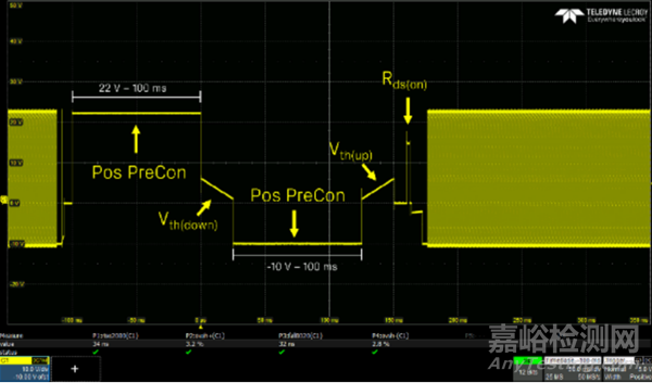 圖2中的曲線與柵極信號(hào)相對(duì)應(yīng)。開始時(shí),可以觀察到300kHz下-10V~+22V 的應(yīng)力施加階段,隨后在測(cè)量過程開始時(shí)暫停。