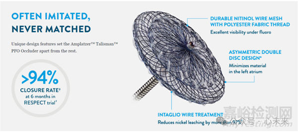 除了最早的Amplatzer PFO封堵器,雅培后續(xù)又推出了Amplatzer Talisman PFO封堵器,是在Amplatzer PFO封堵器技術(shù)基礎(chǔ)上優(yōu)化而來。Amplatzer Talisman與之前產(chǎn)品最大不同在于增加一個新尺寸——30mm,并且都預(yù)先連接到輸送線纜上,減少了醫(yī)生的準(zhǔn)備時間。Amplatzer Talisman完全可回收且允許重新定位,因此能確保封堵在最佳位置。