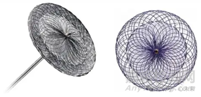 ▲Amplatzer PFO(左)、Amplatzer Talisman封堵器模式圖(右)