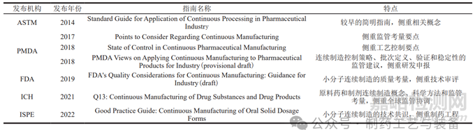 從全球監(jiān)管考量來看,美國食品藥品監(jiān)督管理局 (FDA)、日本獨立行政法人醫(yī)藥品醫(yī)療器械綜合機構(gòu) (PMDA) 等也都發(fā)布有藥品連續(xù)制造相關(guān)的指南細則 [4-7];歐洲藥品管理局 (EMA) 雖然暫沒有提供具體指南,但已通過多種場合表示其目前的監(jiān)管體系足以支持連續(xù)制造的應(yīng)用 [8]。監(jiān)管考量具有一定的地區(qū)特點,相對來說,ICH Q13 總體還是比較框架性的,其延伸更寬泛、包容度更高、在申報資料指導(dǎo)方面更詳細 ;FDA、PMDA 指南相對更具體,在專業(yè)領(lǐng)域的聚焦較深、較細 [9]。除監(jiān)管機構(gòu)外,其他機構(gòu)或組織也在積極推進先進制造。美國藥典委員會在藥品連續(xù)制造的控制策略標準化、成分表征標準化 ( 體現(xiàn)在文獻標準和實物參比標準 )、產(chǎn)品放行標準化、設(shè)備 / 系統(tǒng)要求標準化、傳感技術(shù)標準化以及系統(tǒng)建模標準化方面一直在開展深入研究 [10] ;美國材料與試驗協(xié)會 (ASTM) 于2014 年發(fā)布了“制藥工業(yè)連續(xù)工藝應(yīng)用的標準指南”[11] ;國際制藥工程協(xié)會 (ISPE) 口服固體實踐委員會連續(xù)制造分委會 2022 年也發(fā)布了“良好實踐指南 :口服固體制劑的連續(xù)制造”[12]。這些成果都在推動連續(xù)制造創(chuàng)新和變革過程中發(fā)揮了重要作用。各指南的側(cè)重點簡要對比見表1。