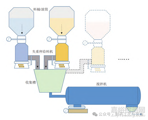 物料處理過程一般包括物料的存儲、連續(xù)給料、混合前收集、攪拌混合以及過程中的各類輸送環(huán)節(jié)等。多數(shù)口服固體制劑尚未能實現(xiàn)端到端連續(xù),一般通過中間料斗在適當批量和時間內(nèi)保持工藝連續(xù)。不同粉末原料的物理性質(zhì)可能不同,對前序工藝條件的保持能力也有差異,因此需要綜合考慮采用機械助流等主動方式驅(qū)動粉末流動或通過重力排出等被動方式引導(dǎo)流動的設(shè)備設(shè)計。連續(xù)工藝的前端涉及原料、物料或中間品的投入,需要主動計量并對投入的物料流進行混合 ;為達到所需的精細控制水平,常需采用批量工藝和連續(xù)工藝配合操作。初始物料輸入通常為批量給料設(shè)備,一旦物料進入生產(chǎn)線,則一般采用失重秤給料機。常見的 PCM物料處理的設(shè)備和流程如圖 1 所示。