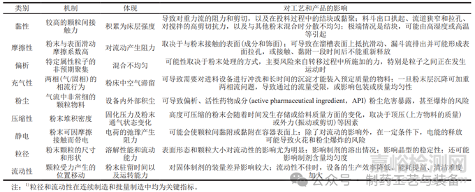 粉末處理不僅是物料輸入的重點,也是多數(shù)連續(xù)制造單元操作中的關(guān)注點。粉末的特征影響操作性能,決定了設(shè)備和工藝參數(shù)的選取及確認。粉末處理特性概況可參見表 2 中的描述 [12]。在物料輸入工藝的研發(fā)和試制過程中應(yīng)充分考慮這些特性對工藝和產(chǎn)品的影響,合理設(shè)計、驗證并制定有效的管理措施。