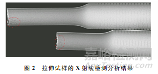 采用X射線數(shù)學(xué)成像檢測(cè)(DR)方法對(duì)拉伸試樣進(jìn)行檢測(cè),結(jié)果如圖2所示,縮松缺陷沿軸向分布并具有一定長(zhǎng)度,其形態(tài)屬于體積型缺陷。