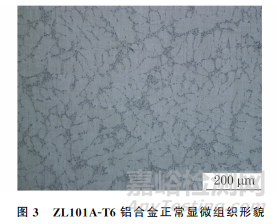 圖3為ZL101A-T6鋁合金正常顯微組織形貌,ZL101A鋁合金正常顯微組織由灰白色基體α固溶體和深灰色共晶硅組成,灰白色基體α固溶體呈樹(shù)枝狀分布,共晶硅組織呈小顆粒和小條狀分布,小條狀共晶硅細(xì)小,整個(gè)組織均勻。