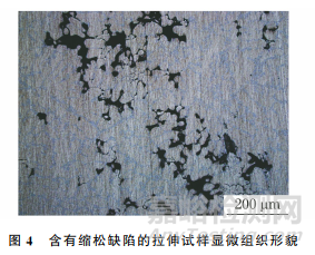 含有縮松缺陷的拉伸試樣顯微組織形貌如圖4所示,可見(jiàn)共晶硅組織比較粗大,基本連續(xù)分布在初生α-Al相上,在縮松缺陷附近可見(jiàn)α-Al相,且具有大量夾雜物。