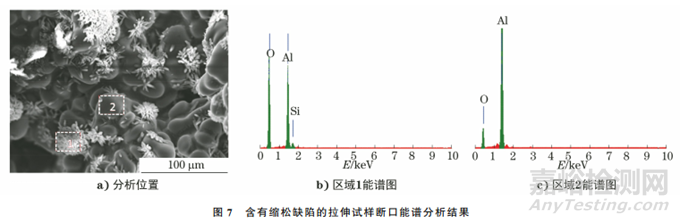 利用能譜分析儀對(duì)含有縮松缺陷的拉伸試樣斷口進(jìn)行分析,結(jié)果如圖7所示。由圖7可知:區(qū)域1主要含有O、Al、Si等元素,O、Al、Si元素的質(zhì)量分?jǐn)?shù)分別為68.39%,27.53%,4.07%,為Al2O3晶體;區(qū)域2主要含有O、Al等元素,O、Al元素的質(zhì)量分?jǐn)?shù)分別為35.87%,64.13%,主要為Al基體和氧化物。