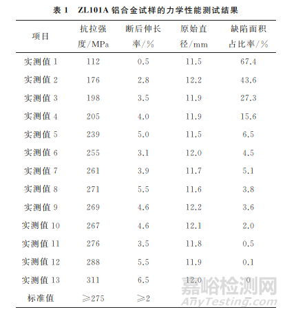 ZL101A鋁合金的力學(xué)性能與材料內(nèi)部缺陷有關(guān)。在室溫條件下,依據(jù)GB/T 228.1—2021 《金屬材料 拉伸試驗(yàn) 第1部分:室溫試驗(yàn)方法》,對(duì)該批次正常ZL101A鋁合金試樣進(jìn)行力學(xué)性能測(cè)試,結(jié)果如表1所示。
