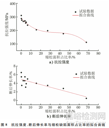 采用最小二乘法對(duì)抗拉強(qiáng)度、斷后伸長(zhǎng)率與縮松缺陷面積占比率進(jìn)行擬合,擬合曲線如圖8所示。由圖8可知:隨著斷口縮松缺陷面積的增加,ZL101A鋁合金的力學(xué)性能整體呈下降趨勢(shì),其中最小抗拉強(qiáng)度為112MPa,最小斷后伸長(zhǎng)率為0.5%,遠(yuǎn)低于標(biāo)準(zhǔn)要求。