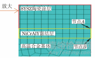 建立的有限元模型及網(wǎng)格劃分如圖1所示,選取位于8YSZ陶瓷涂層與黏結(jié)層界面、黏結(jié)層與基體界面最右端的兩個節(jié)點(節(jié)點A和節(jié)點B)作為典型節(jié)點進行隔熱效果和應(yīng)力分析。