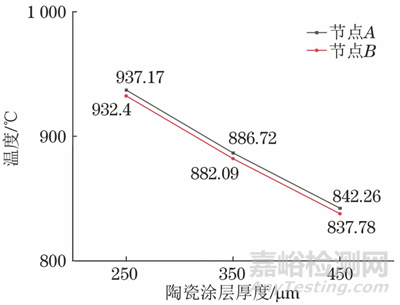 由圖4可以看出,陶瓷涂層越厚,節(jié)點A和節(jié)點B處的溫度越低,與表面溫度的差值越大。表面與節(jié)點B之間的溫差越大,說明隔熱效果越好。