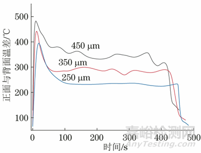 圖5 不同陶瓷涂層厚度熱障涂層的正面與背面溫差隨時間的變化曲線