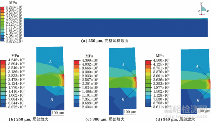 當(dāng)陶瓷涂層厚度分別為250,300,340 μm時,由圖6中提取得到的A點處的瞬時應(yīng)力,亦即模型中的最大應(yīng)力分別為424.83,439.86,450.00 MPa,超過了黏結(jié)強度(一般在20~60 MPa),有可能超過陶瓷涂層的斷裂強度(一般在200~900 MPa)。這表明在升溫過程中,涂層可能最先從A點處開裂、剝落以釋放應(yīng)力。