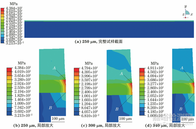 圖6 模擬得到不同陶瓷涂層厚度熱障涂層首次升溫20 min時的Mises等效應(yīng)力分布